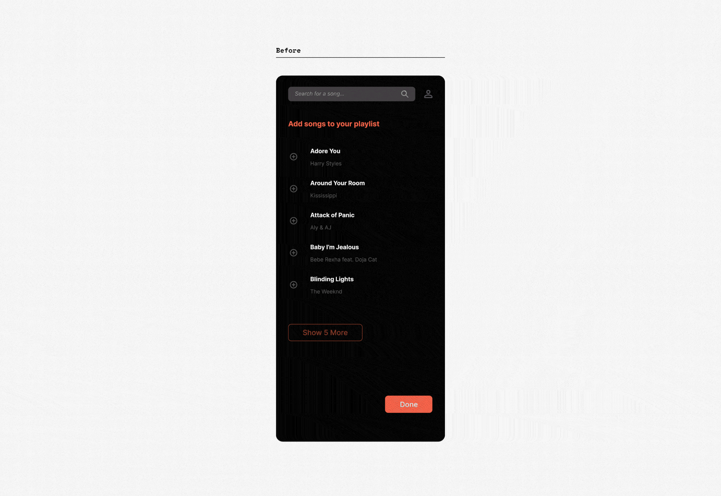 Users were confused about was that songs appeared in a list of 5 and 10, and that they’d have to click on a button to expand the song selections. They found that extra step annoying and brought up the concern “what happens if the song I’m looking for is not in the top ten search results?”