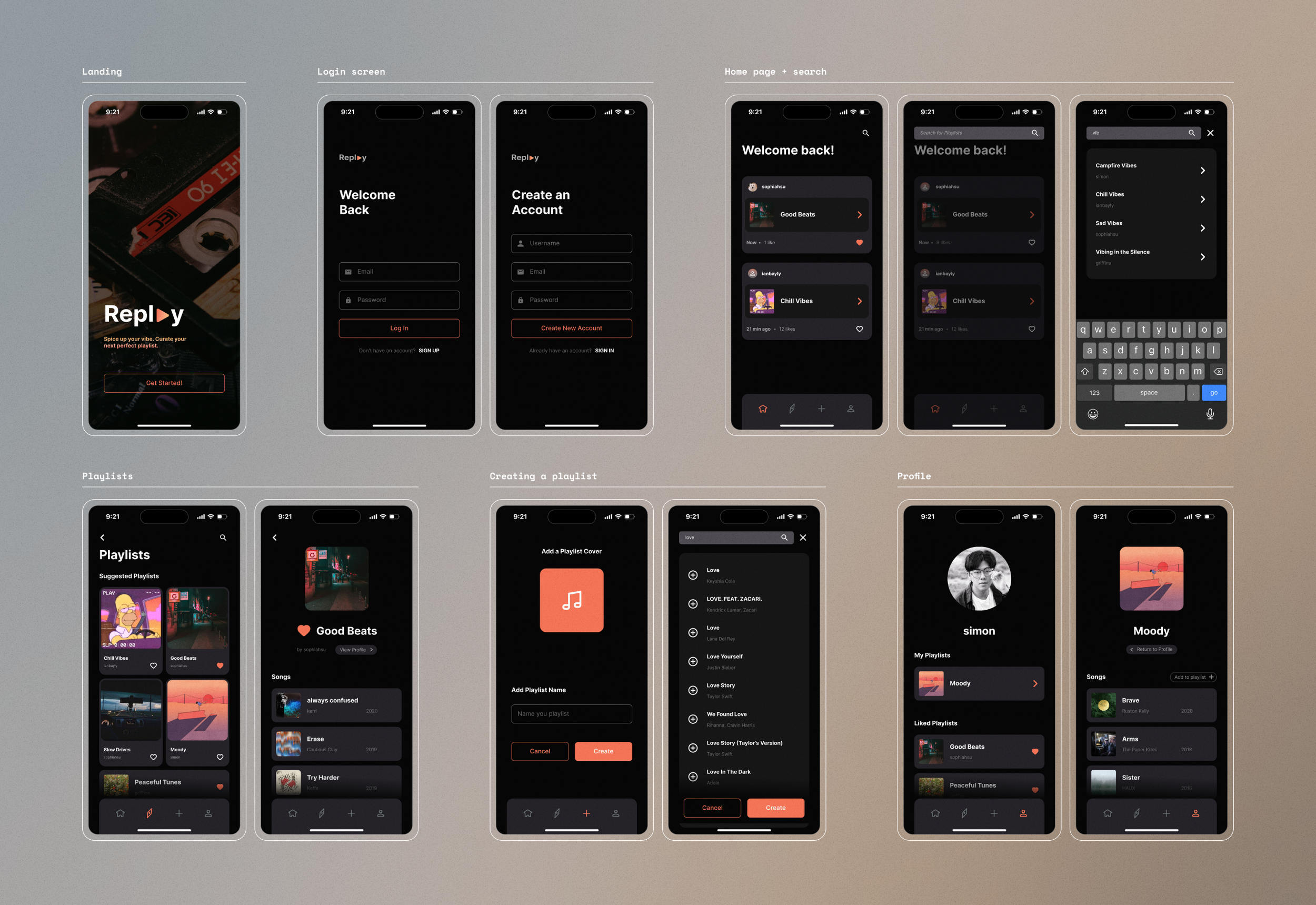 We wanted to create an application that reduces the need to rely on external apps when sharing playlists. Through looking at (would would be considered) Replay’s main competitors- Spotify and Apple Music- we discussed repeating problems that we wanted to solve with our application.